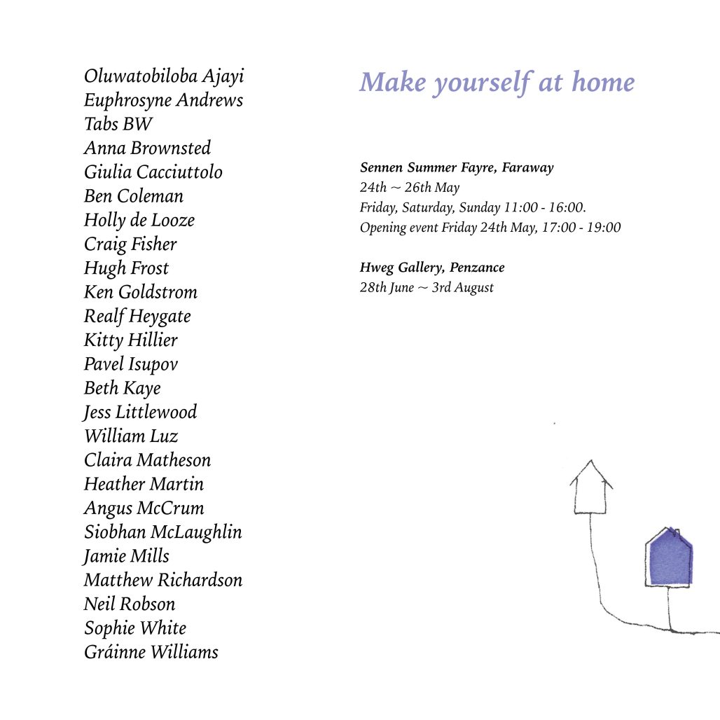 | After showing at this year’s Sennen Summer Fayre, Make yourself at home will open at Hweg, running from 28th June ~ 3rd August. Opening night Friday 28th from 18:00-21:00. All are welcome. The exhibition builds up an image of a house, room by room, through the works of 25 artists. Presenting a wide range of mediums, ideas, and practices. Showing work by: Oluwatobiloba Ajayi Euphrosyne Andrews Tabs BW Anna Brownsted Giulia Cacciuttolo Ben Coleman Holly de Looze Craig Fisher Hugh Frost Ken Goldstrom Realf Heygate Kitty Hillier Pavel Isopov Beth Kaye Jess Littlewood William Luz Claira Matheson Heather Martin Angus McCrum Siobhan McLaughlin Jamie Mills Matthew Richardson Neil Robson Sophie White Gráinne Williams Co curated by Julia Gros and Joe Lyward |